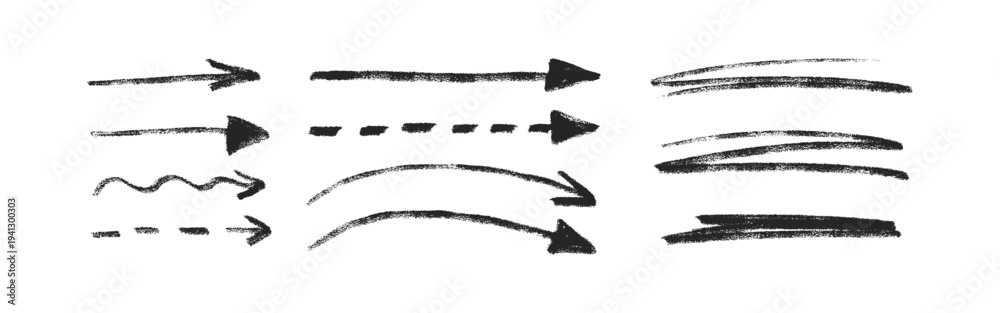 Arrows and underlines textured pencil elements. Set of hand drawn vector highlighting graphics. #1941300303