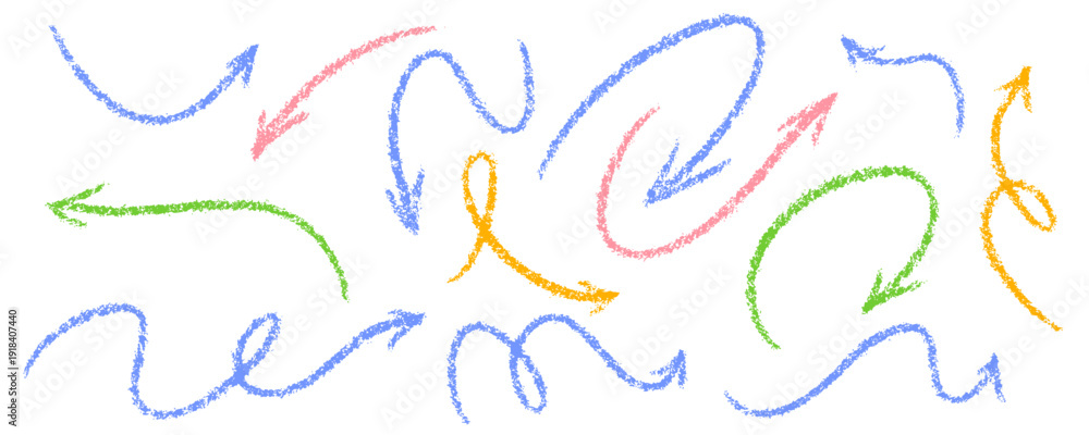 Arrows in doodle style with wax crayon, chalk and marker texture. Vector colorful arrow illustration. Abstract sketch with playful children art elements #1918407440