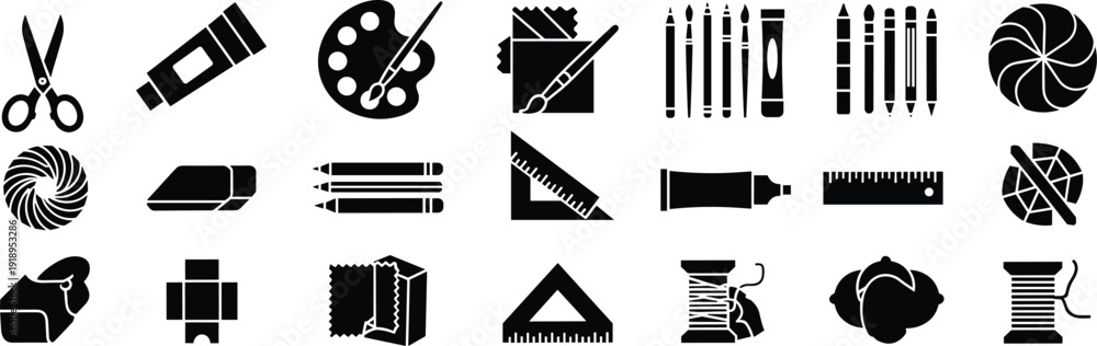Art and craft supplies silhouette icon set, scissors, pencils, paint palette, brushes, yarn, thread, ruler, vector illustration #1918953286