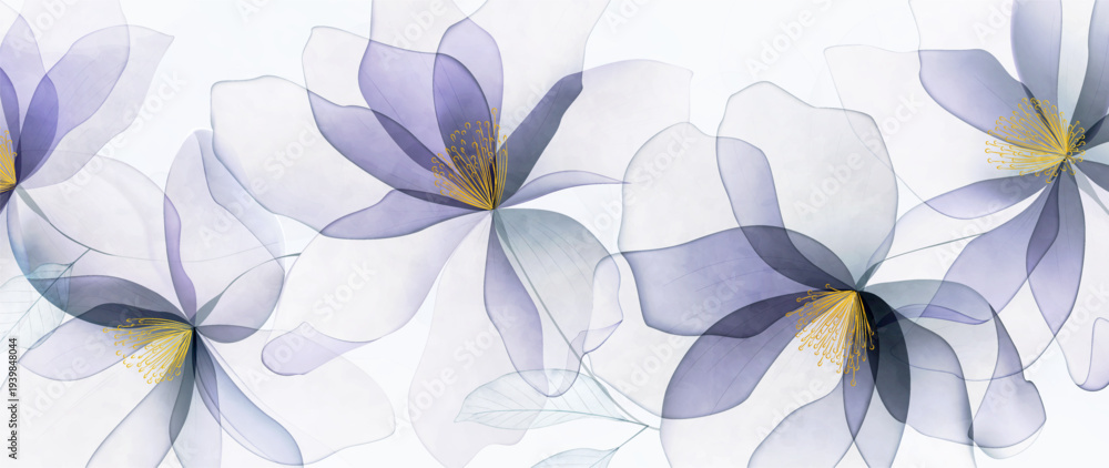 Art backdrop featuring transparent purple flowers with golden watercolor accents. Botanical floral banner for decor, prints, posters, textiles, wallpaper, and interiors. #1939848044