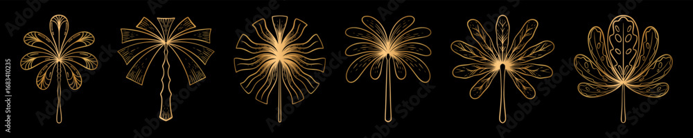 Art deco logo. Palm flower icon. Organic Boho elements with plant leaf ornament. Vintage modern leaves. Elegant symmetry foliage. Gold tree. Abstract nature. Vector line design icons set #1683410235