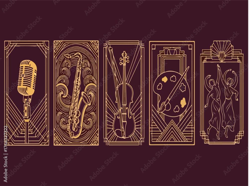 Art Deco vector panels set featuring music, dance, and visual arts icons on dark background #1766327322