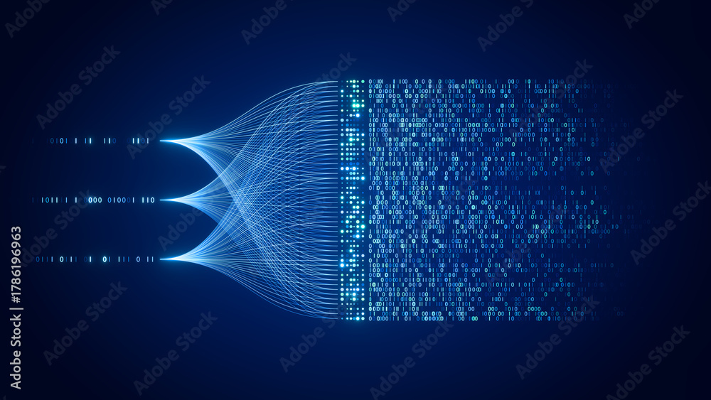 Artificial intelligence data processing and machine learning concept, digital neural network with binary code and data flow visualization on blue background #1786196963