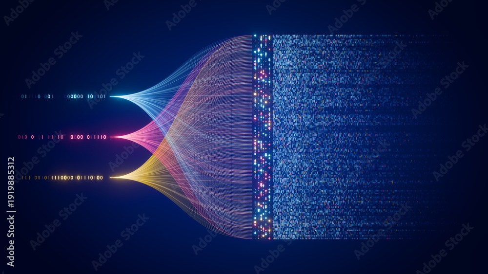 Artificial intelligence neural network processing big data streams, abstract digital data flow, process automation and analytics technology background. Innovation and digital transformation. #1919885312
