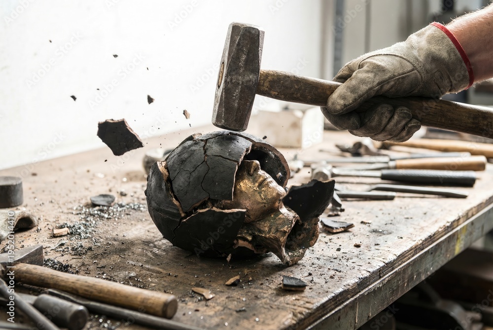 Artisan using a hammer to break a clay shell revealing a cast bronze head sculpture #1952014410