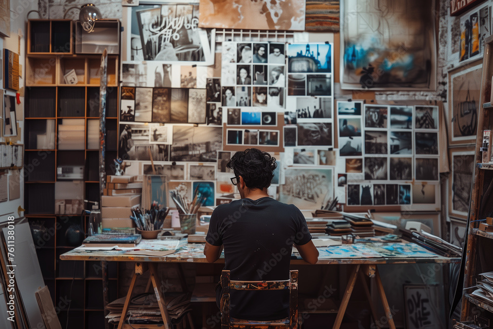 Artist Contemplating Photographic Collage in Studio #761138018