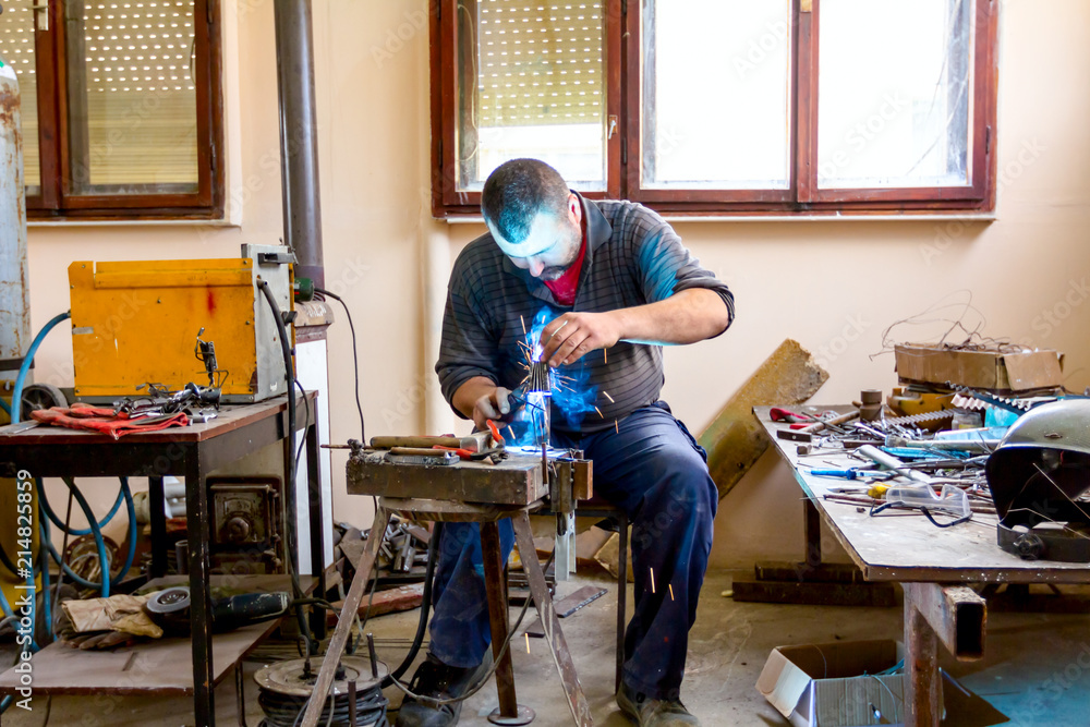 Artist is making figure by welding few metal wires in his workshop, barehanded #214825859