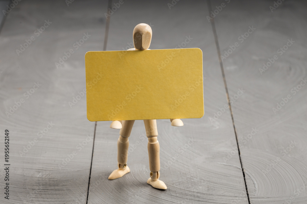 Artist mannequin presenting empty yellow placard, customizable communication and announcement #1955652149