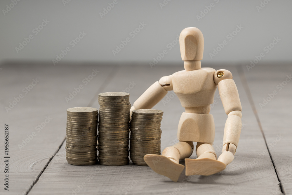 Artist mannequin sitting next to coin piles, financial growth and prosperity theme #1955652187