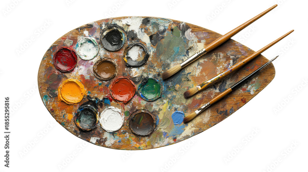 Artist paint palette and brushes. Colorful paints mixed. Art supplies for painting. Creative tools. #1855295816