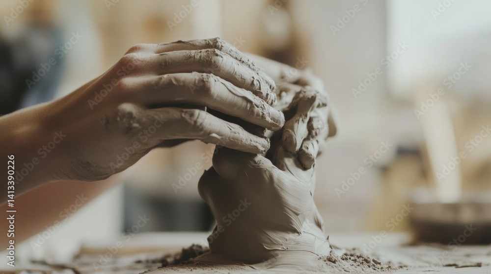 Artist sculpting clay into a figure in a studio. Featuring sculpting process and craftsmanship #1413390226