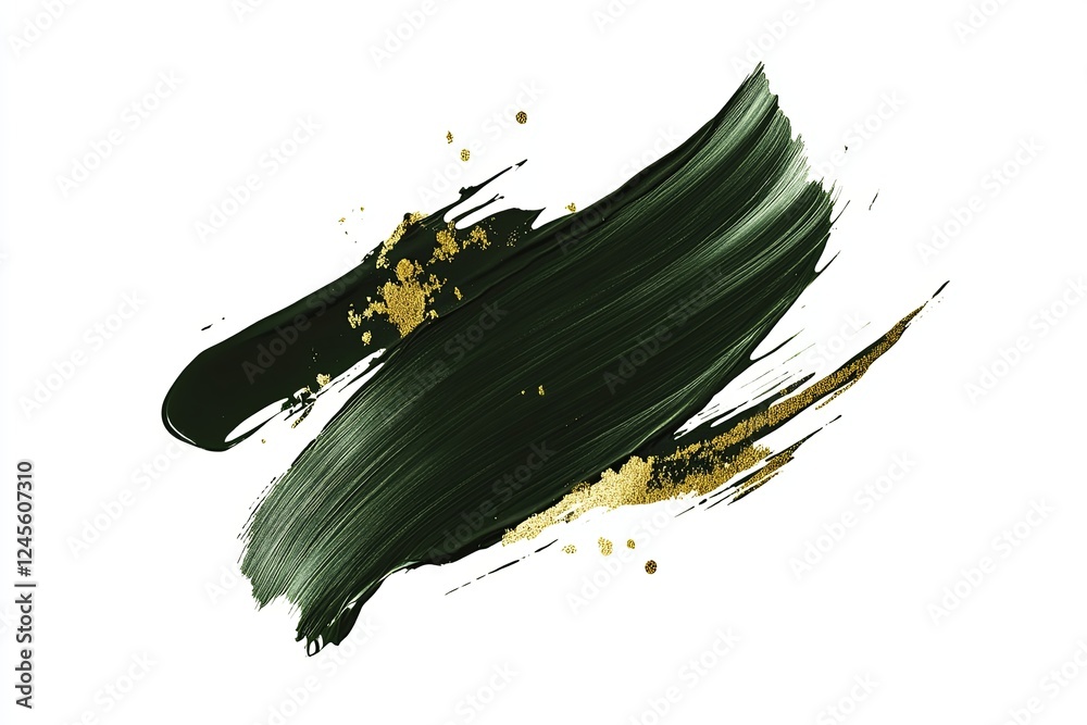 Artistic brush stroke with dark green paint and shimmering gold accents on a clean white background #1245607310