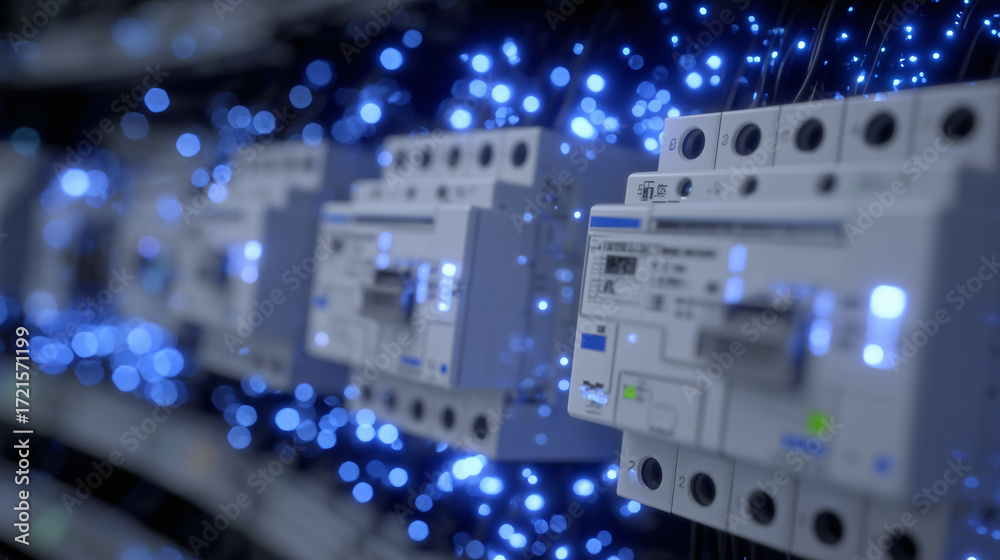 Artistic close-up of PLC modules lined on DIN rail, shadowed contours with glowing background giving futuristic feel #1721571199