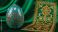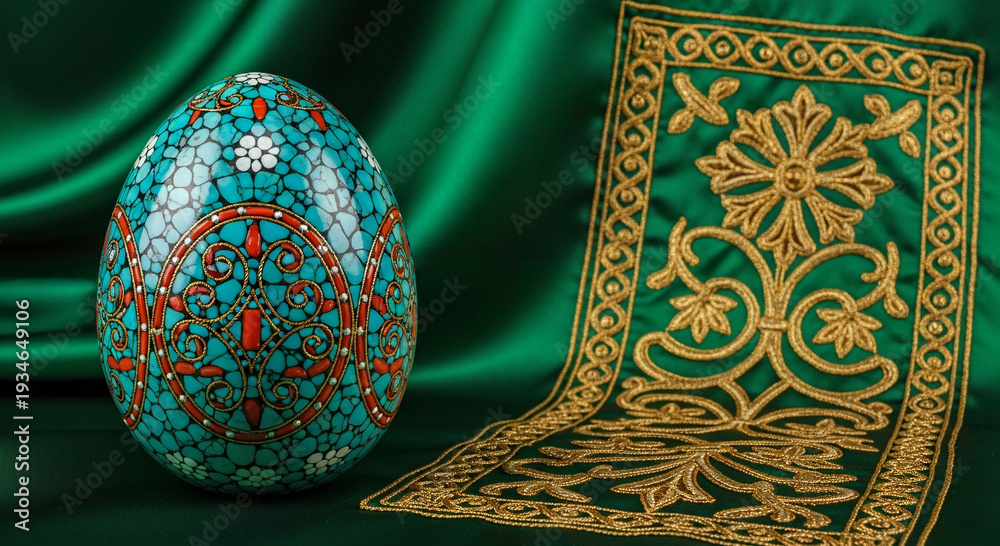 Artistic Easter egg with a golden ornament on a green napkin, oriental motifs, a symbol of luxury and traditions, interior decor, Easter, Novruz #1934649106