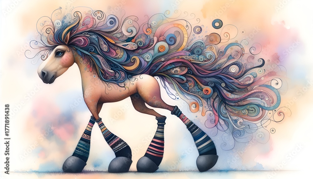 artistic illustration of a horse in motion, characterized by an extraordinary flowing mane and tail that dominate the composition. the horse has a naturalistic cream or tan-coloured body #1771891438