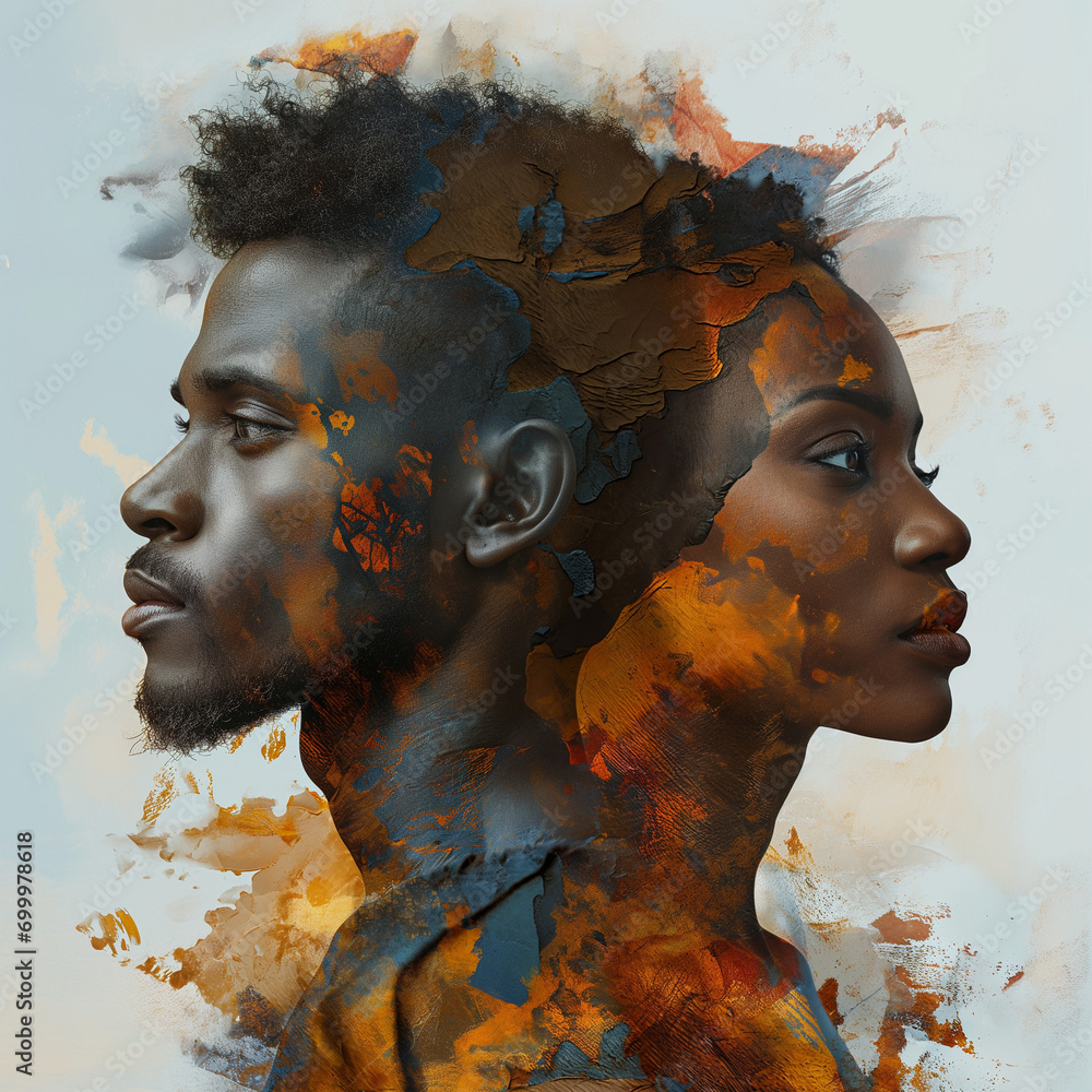 Artistic poster featuring a black man and woman in profile with double exposure map detailing, for Black History Month. #699978618