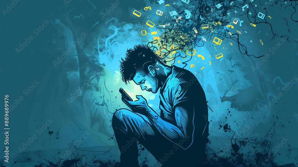 Artistic representation of a man or teen addicted to his phone, social media obsession, doom scrolling, landscape format 16:9 with copy space #889689976