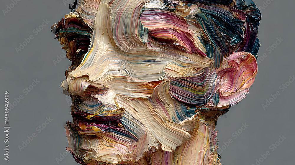 Artistic Transformation: A close-up view of an artful portrait sculpted from colorful brushstrokes, showcasing a dynamic interplay of textures and hues. #1960942809