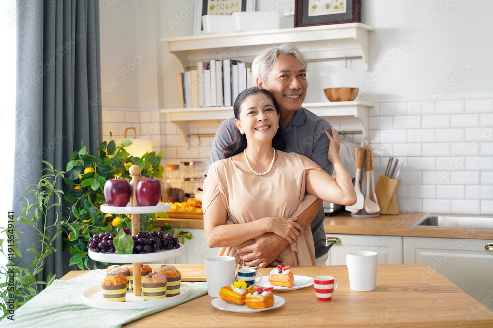 Asia happy senior elderly couple hugging and embrace at kitchen room.  Senior couple happy cooking food and cake at home after retirement. Family Concept #1913549141