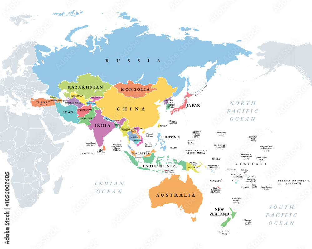 Asia-Pacific region, multi colored political map of the Indo-Pacific. Countries and territories of a major geopolitical and economic region of the world, adjoining the western Pacific Ocean. Vector #1856007685