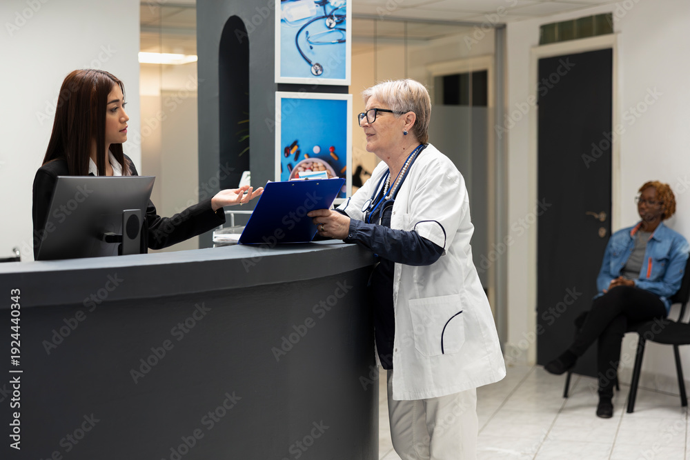 Asian administrator discusses reports and scheduled appointments with elderly general practitioner at front desk. Senior doctor holds clipboard, reviewing patient registrations with receptionist. #1924440343