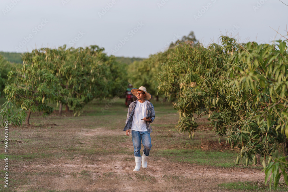 Asian agricultural worker walking in mango farm Thailand inspecting mango tree and orchard condition for quality control, sustainable food production and harvest season planning. #1962872054