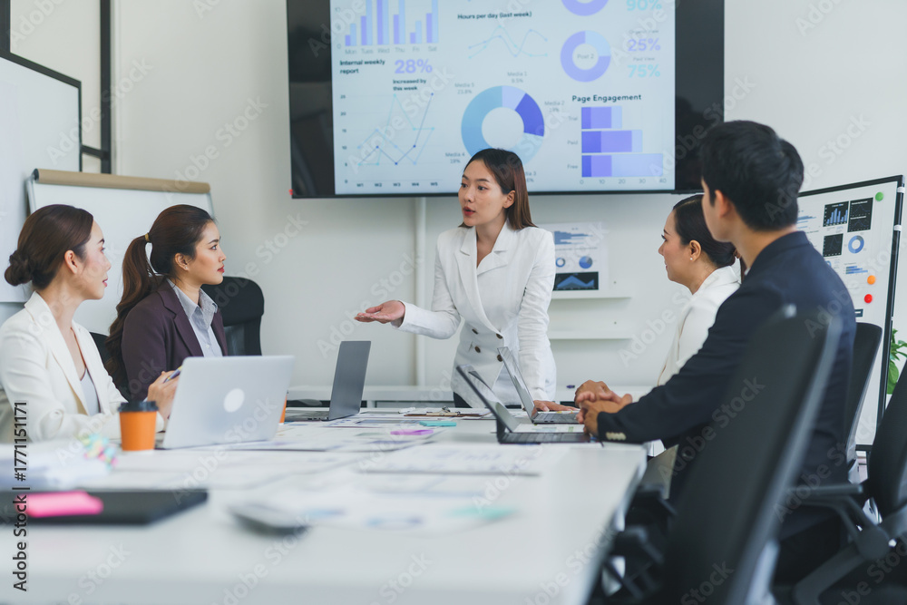 Asian businesswoman discussing performance data with colleagues during a marketing and data analysis meeting in a modern office #1771151171