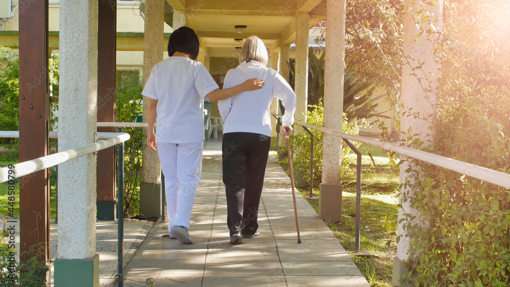 Asian doctor helping elderly retired woman with walker stick in the hospital yard. Rehabilitation concept #448580799