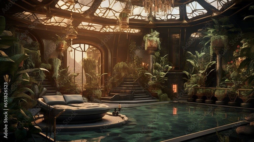Asian exotic futuristic style greenhouse spa in art deco design interior at a luxury hotel #651826523