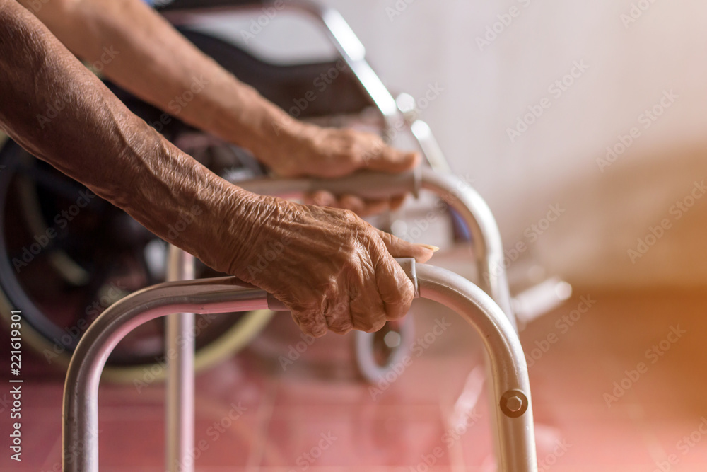 Asian old woman standing with her hands on a walker stand,Hand of patient woman holding a walking aid #221619301