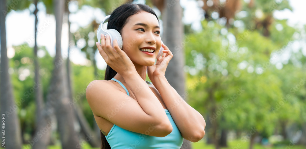 Asian sports woman listening to music on headphones outdoors. Female in sportswear standing against in park. Happy lady athlete taking a break from her workout #1926048413