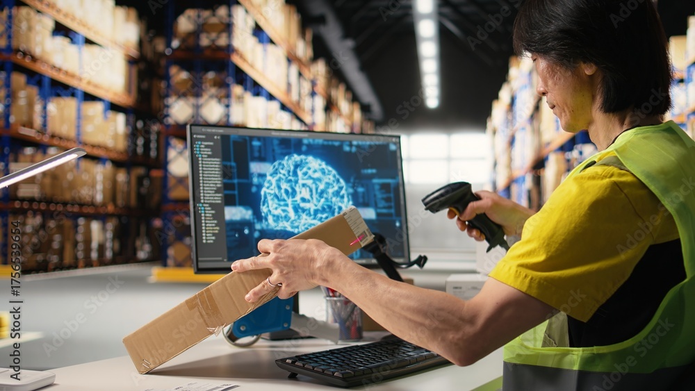 Asian staff member using artificial intelligence to scan shipping labels, registering barcodes with shipment details with AI support brain automation. E-commerce with virtual help. Camera A. #1756539654