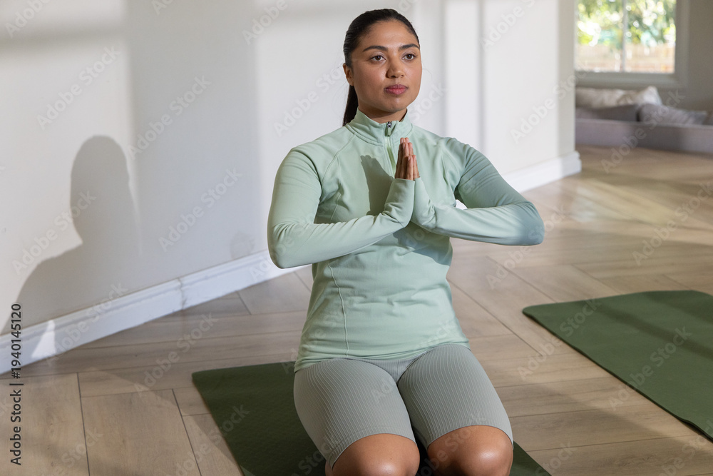 Asian woman kneeling on green yoga mat in living area wearing mint top and grey shorts #1940145120