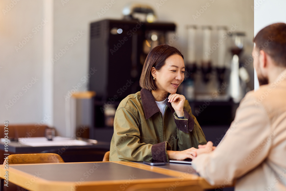 Asian Woman Talks With Man At Cozy Café Table During Casual Conversation Over Coffee And Laptop #1901043743