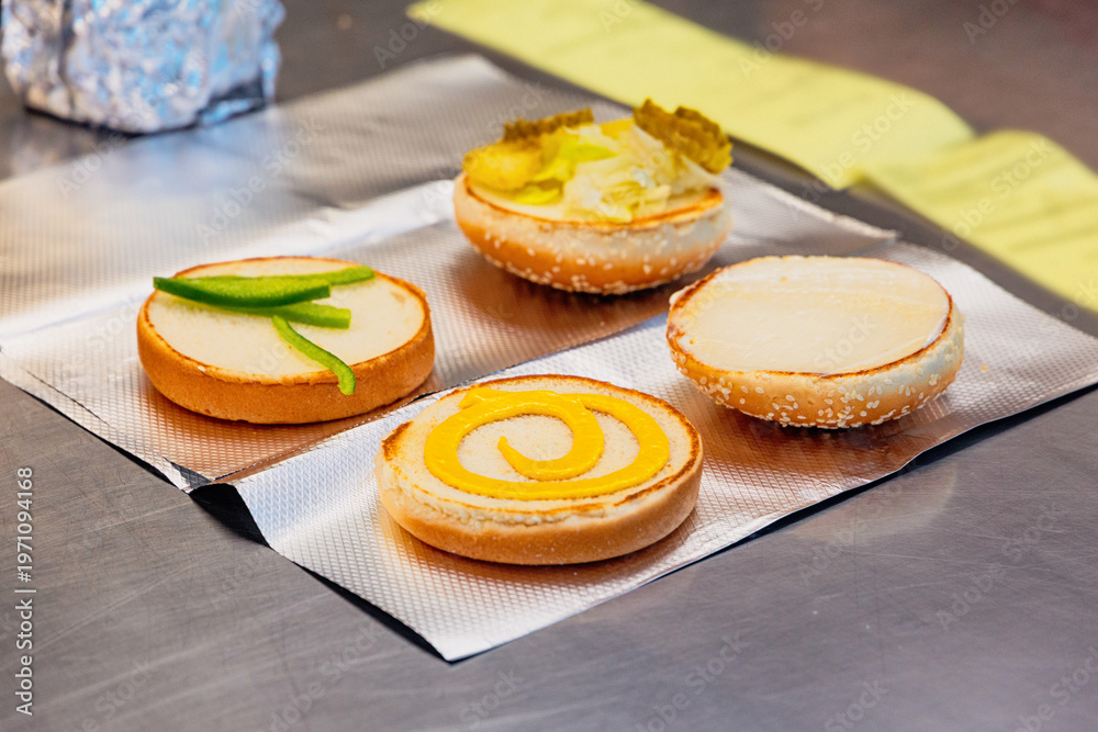 Assembling delicious burgers with toasted buns, sliced peppers, pickles, and mustard at a fast food station #1971094168