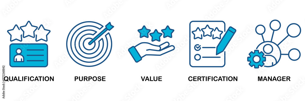 Asset manager icon set Blue Monochrome Flat Design concept for qualification, purpose, value, certification and manager #1772268842