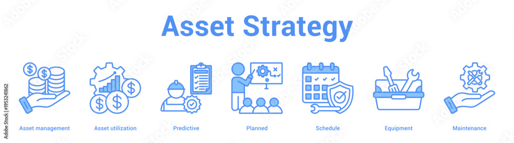 Asset Strategy web banner icon set vector illustration concept for business with icon of Asset management, Asset utilization, Predictive, Planned, Schedu. #1953241862