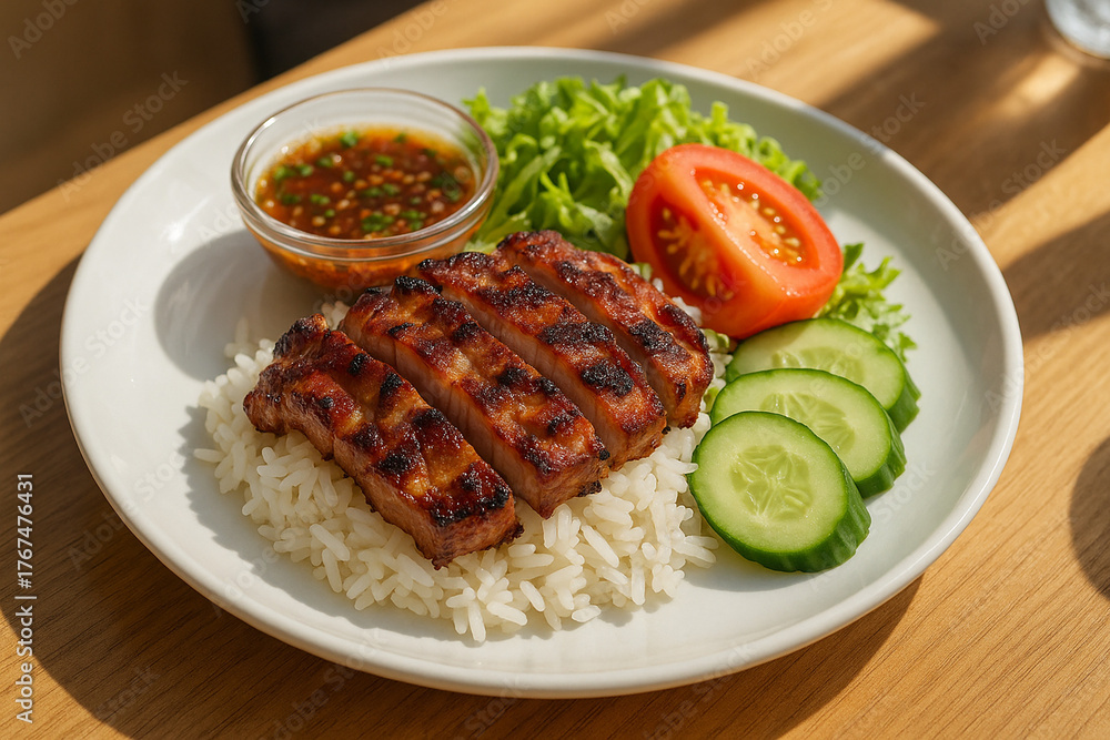 Assiette de porc grillé avec riz et légumes frais #1767476431