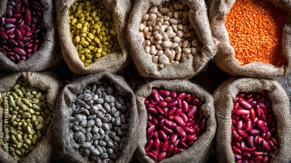 Assorted beans and lentils in burlap bags displaying diversity #1911527992