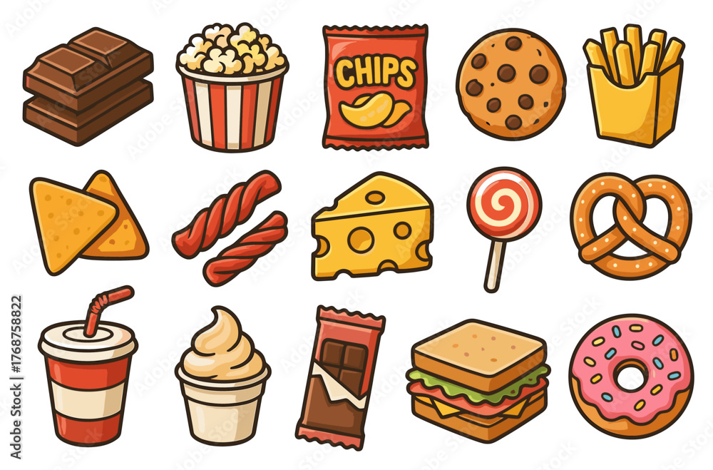 Assorted cartoon snacks with chips, chocolate, and pretzel on white background #1768758822
