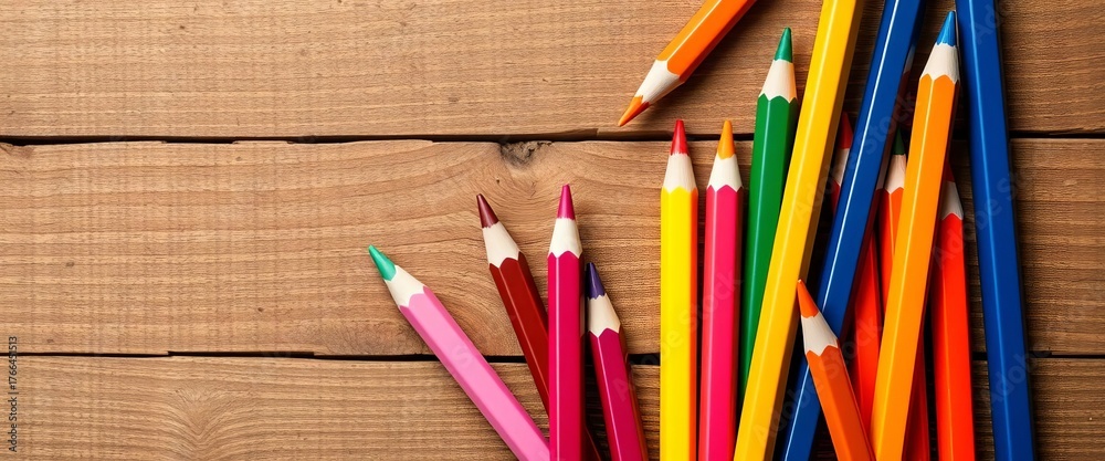 Assorted color pencils scattered on a textured wooden background, school supplies, back to school #1766451513