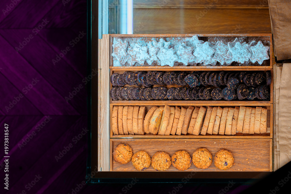 Assorted cookies bakery counter food retail place top view frame work in a wooden tray on a purple background with a glass top #1973818547