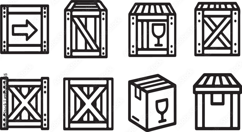 Assorted crates and boxes with various symbols and designs. Vector #1924513655