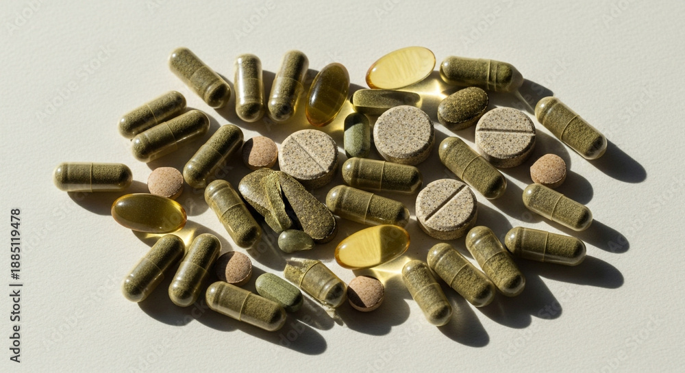 Assorted dietary supplements including capsules and tablets in various shapes and sizes scattered on a plain white surface illuminated by natural light #1885119478