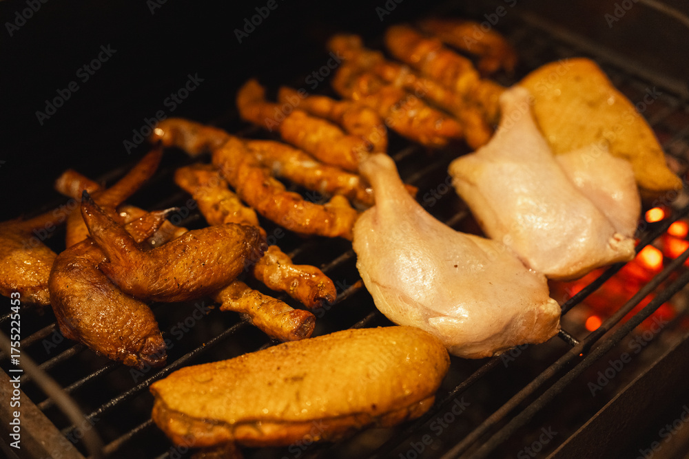 Assorted raw meats prepared for outdoor BBQ party, including beef steak, pork, chicken wings placed inside wooden cooler box ready for grilling and cooking during backyard barbecue gathering #1755225453