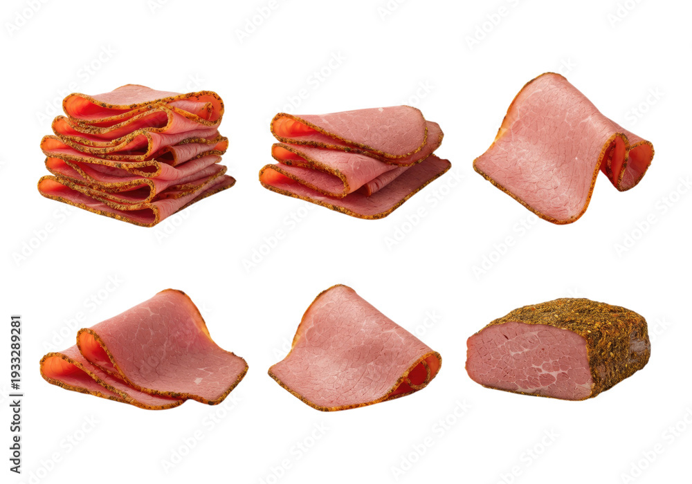 Assorted thin pastrami and roast-style beef slices with peppered crust, folded and stacked on a transparent background #1933289281