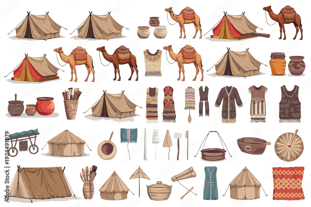 Assorted vintage desert camping and nomadic lifestyle illustrations #1924491079