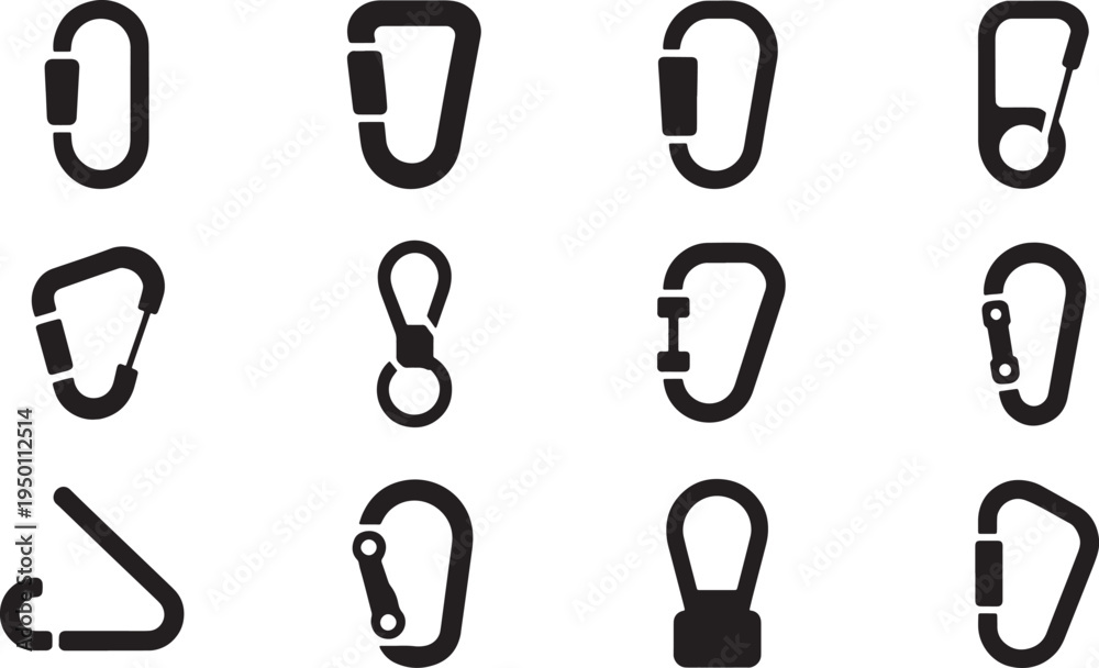 Assortment of climbing carabiners and safety clips vector icons #1950112514