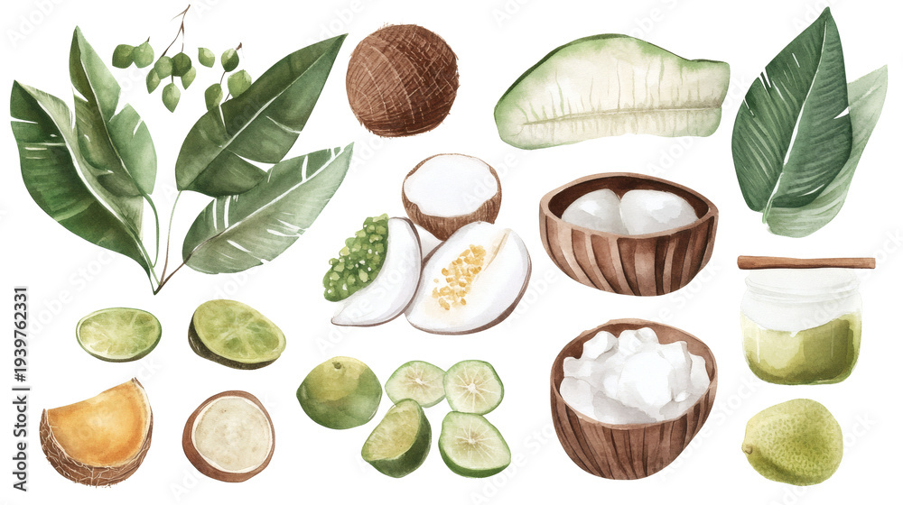 Assortment of Southeast Asian snacks and grilled meats arranged on banana leaves and bowls, colorful dipping sauces and lime wedges, watercolor style #1939762331