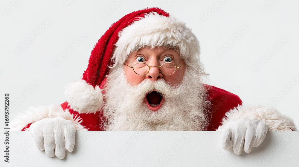 Astonished Santa Claus peeking over blank surface ready for your holiday message or promotion, festive and fun #1693792260